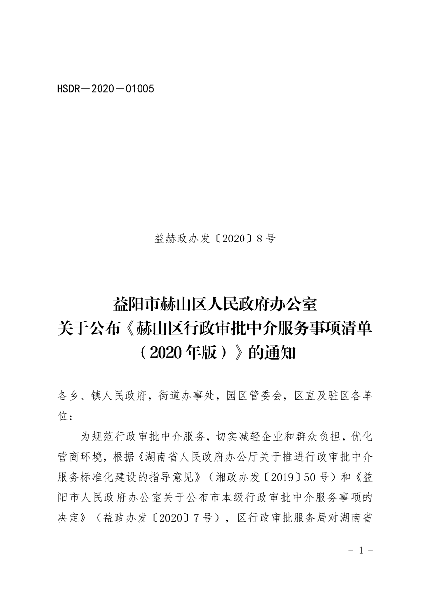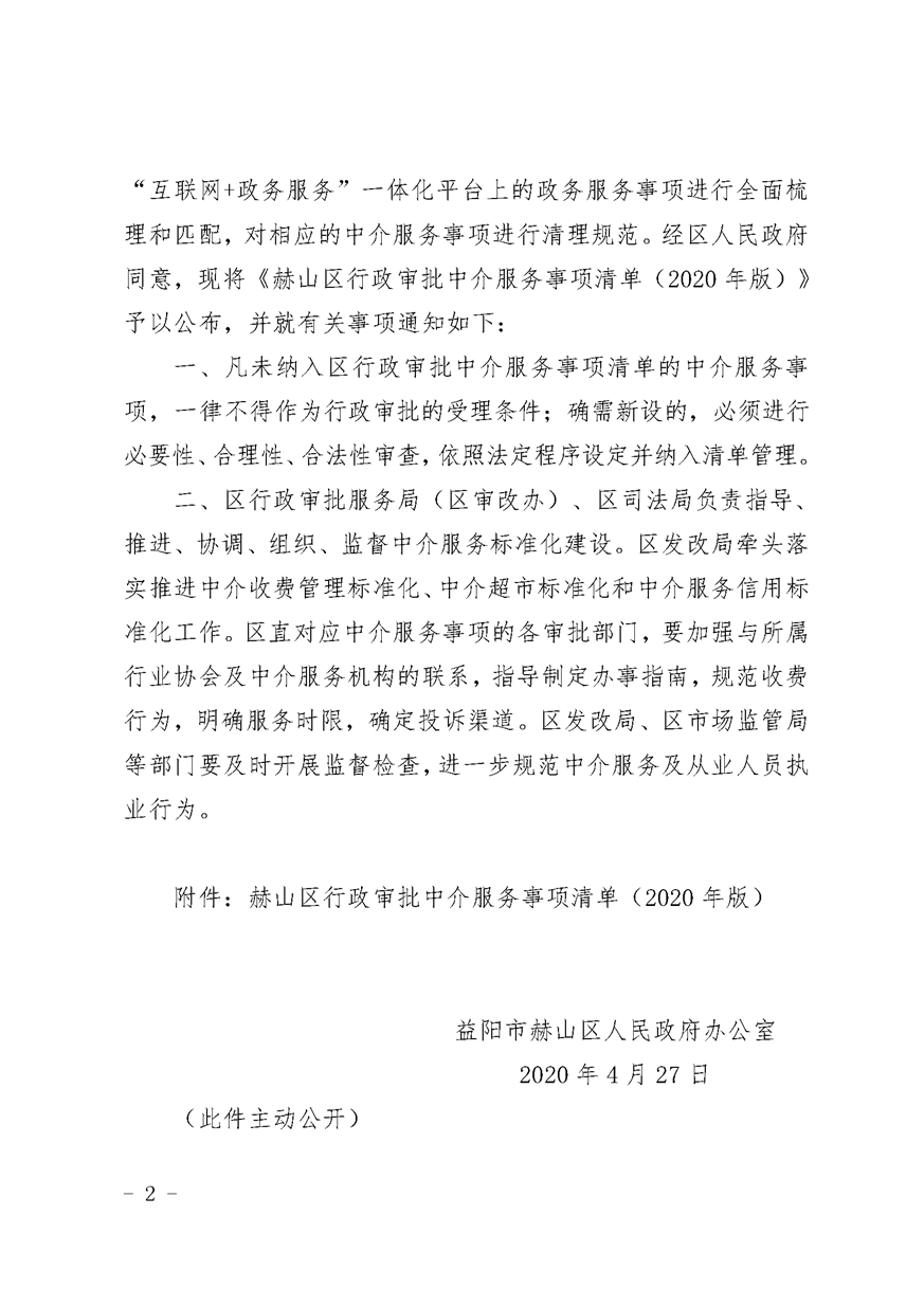 益阳市赫山区人民政府办公室关于公布《赫山区行政审批中介服务事项清单(2020年版)》的通知