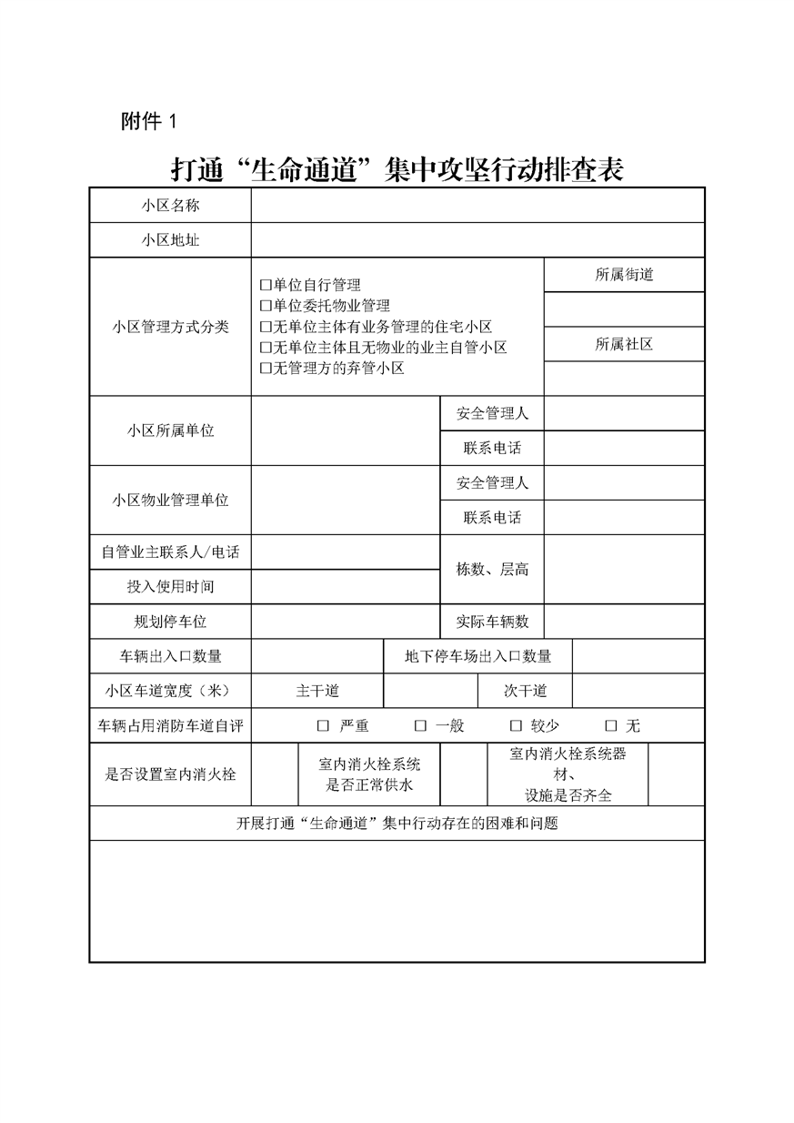 2.集中开展居民住宅区摸底建档。按照属地原则,运用“网格化”排查手段,对辖区内居民住宅及单位开展摸底排查并填写打通“生命通道”集中攻坚行动排查表(详见附件1),摸清管理责任主体及存在的问题,并及时汇总上报相关信息。(责任单位:街道<乡镇、园区>、区消防救援大队)