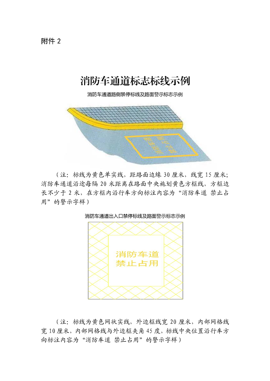 1.集中施划消防车通道标线标志和停车位。6月底前,按照标志施划模板(详见附件2)完成消防车通道标线标志施划工作。有管理主体的单位(工厂企业、商业综合体、学校、医院、养老机构、公共娱乐场所、有物业服务机构的住宅小区),消防车通道和停车位标线标志施划工作由管理主体或物业服务企业实施;无管理主体的单位(自建房、安置小区、无物业服务机构的老旧小区),由区住建局负责实施。(责任单位:区住建局、区消防救援大队、街道<乡镇、园区>、相关行业主管部门)