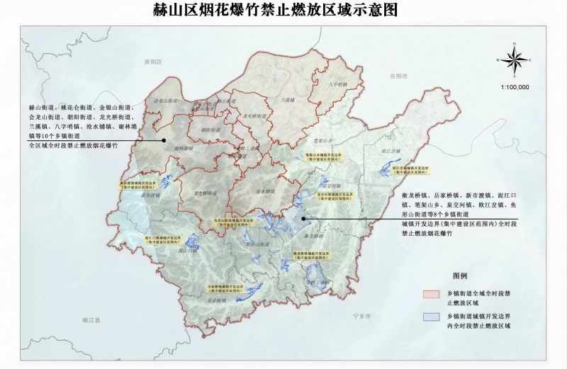 (一)赫山街道、桃花仑街道、金银山街道、会龙山街道、朝阳街道、龙光桥街道、兰溪镇、八字哨镇、沧水铺镇、谢林港镇等10个乡镇街道全区域全时段禁止燃放烟花爆竹;