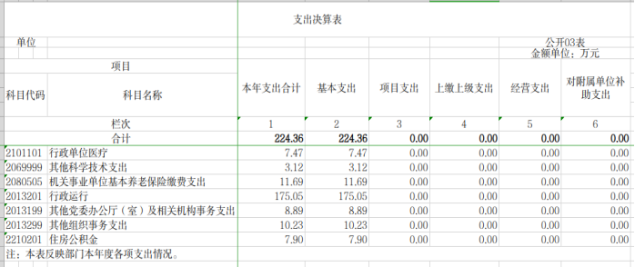 2023年度支出合计224.36万元,其中:基本支出224.36万元,占100%;项目支出0万元;上缴上级支出0万元;经营支出0万元;对附属单位补助支出0万元。