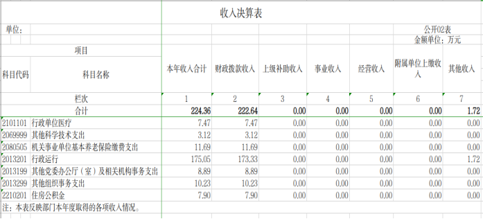 2023年度收入合计224.36万元,其中:财政拨款收入222.64万元,占99.23%;上级补助收入0万元;事业收入0万元;经营收入0万元;附属单位上缴收入0万元;其他收入1.72万元,占0.77%。