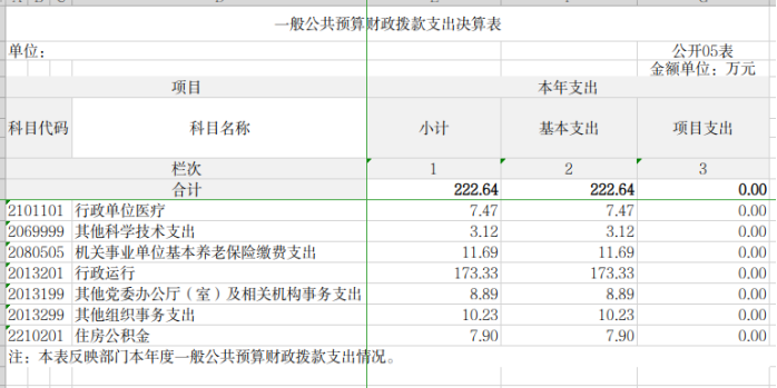2023年度财政拨款支出222.64万元,主要用于以下方面:一般公共服务(类) 192.45万元,占86.44%;科学技术支出3.12万元,占1.41%;社会保障和就业(类)11.69万元,占5.25 %;卫生健康(类)7.47万元,占3.36%;住房保障(类)7.9 万元,占3.54%。