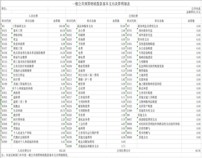 公用经费40.36万元,占基本支出的18.12%,主要包括办公费、印刷费、咨询费、手续费、邮电费、 物业管理费、差旅费、维修(护)费、 会议费