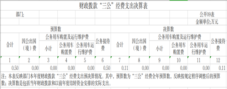“三公”经费财政拨款支出预算为0.5万元,支出决算为0.11万元,完成预算的22%,决算数小于预算数的主要原因是厉行节约,减少三公经费支出,与上年相比减少0.07万元,减少38.88%,减少的主要原因是厉行节约,减少三公经费开支。其中: