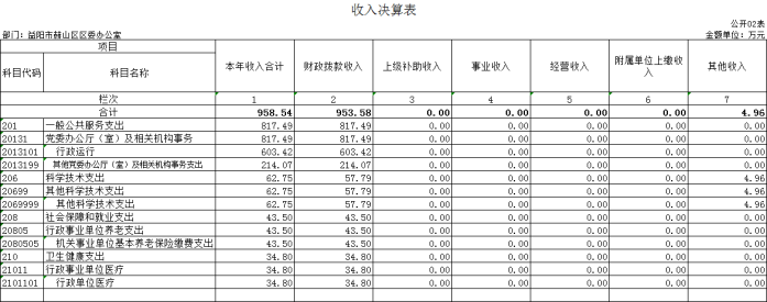 2022年度收入合计958.54万元,其中:财政拨款收入953.58万元,占99.48%;上级补助收入0元,占0%;事业收入0万元,占0%;经营收入0万元,占0%;附属单位上缴收入0万元,占0%;其他收入4.96万元,占0.52%。