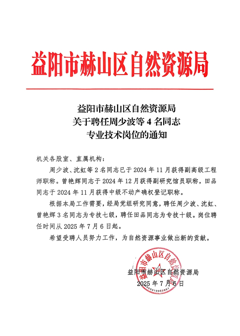 益阳市赫山区自然资源局关于聘任周少波等4名同志专业技术岗位的通知