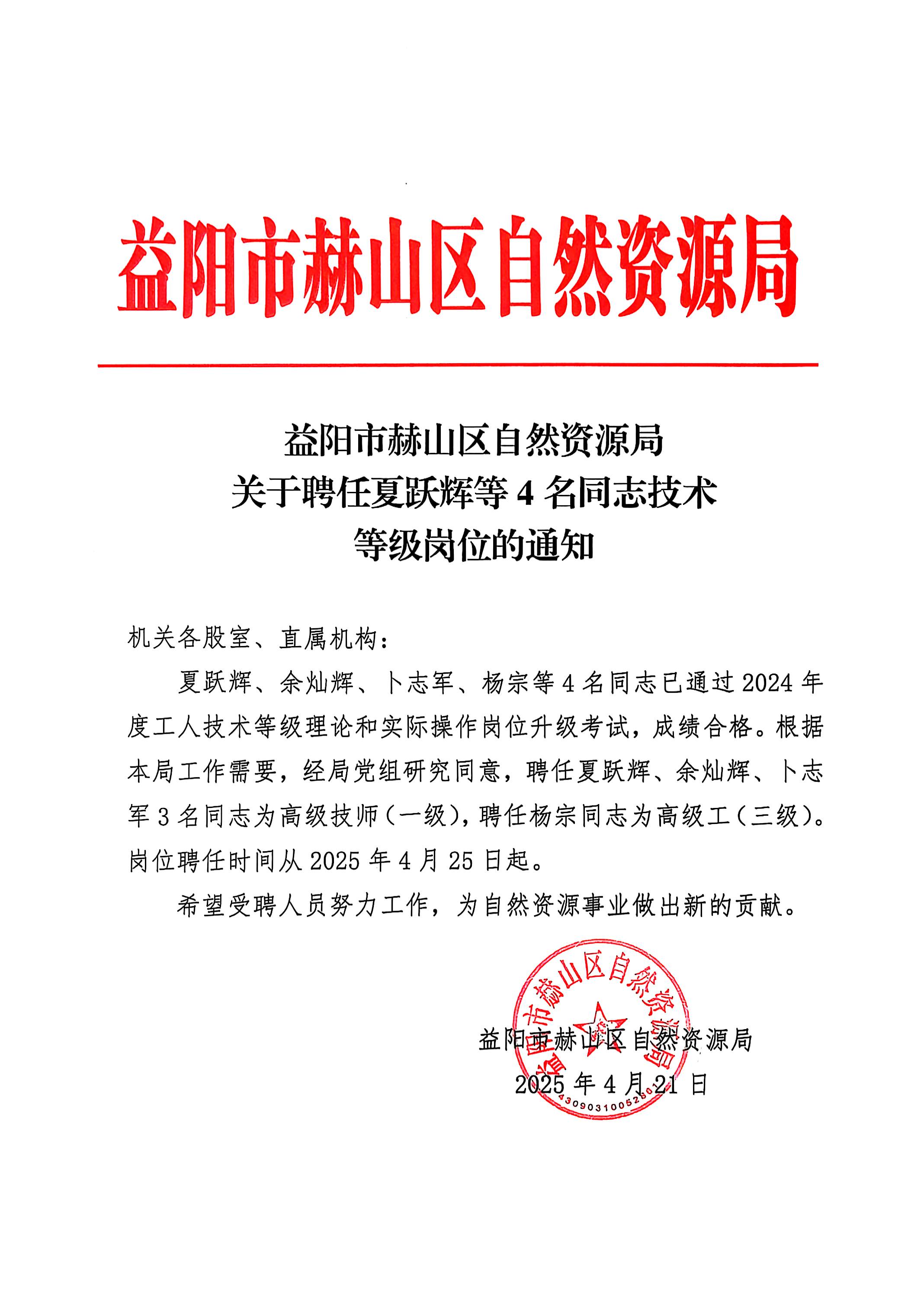 益阳市赫山区自然资源局关于聘任夏跃辉等4名同志技术等级岗位的通知
