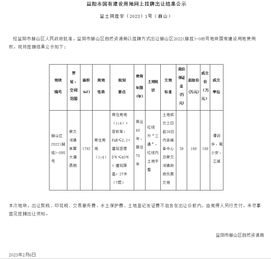 阳市国有建设用地网上挂牌出让结果公示 益土网挂字〔2023〕1号(赫山)