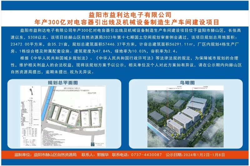 益阳市益利达电子有限公司年产300亿对电容器引出线及机械设备制造生产车间建设项目修建性详细规划方案批前公示