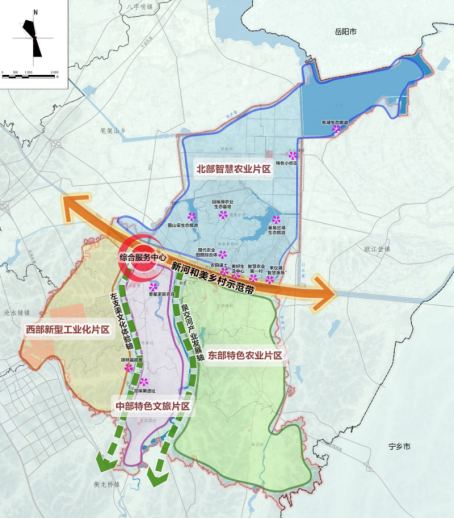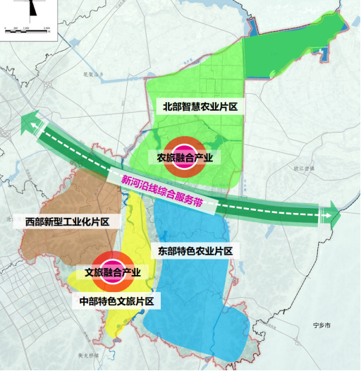 产业发展布局。规划期内重点做好稻米、水产、文旅三大特色产业文章,形成“智慧农业、教育研学、乡村旅游”三大产业发展主线,形成“一带两核四区”的产业发展格局,“一带”为新河沿线综合服务带,“两核”指新河以南以“林翼文化”为核心的文旅融合产业及新河以北以“美丽田园”为核心的农旅融合产业,“四区”为西部新型工业化片区、中部特色文旅片区、东部特色农业片区、北部智慧农业片区。