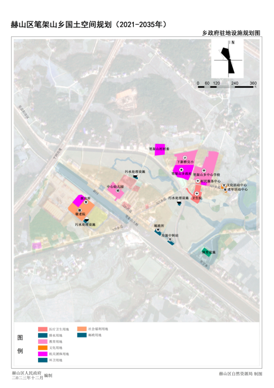 公共管理与公共服务设施用地规划。规划公共管理与公共服务设施用地面积8.5公顷,占镇驻地总用地的9.99%。保留现有乡政府以及其他办公用地,规划新增机关团体用地主要为笔架山村委、派出所,分布位于和美路以北、新河南路以南。扩建笔架山乡中小学及中心幼儿园,规划将供水厂北侧规划为体育用地,规划扩建现状卫生院,规划保留集镇新河北路、325乡道两侧商业服务业用地,均以商住综合用地为主。