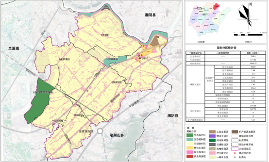 全镇共划分为生态保护区、生态控制区、农田保护区、城镇发展区、乡村发展区、矿产能源发展区6类规划一级基本分区,并对城镇发展区和乡村发展区进行进一步细化。