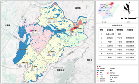 三区:以镇区商贸等服务为基础的集镇综合服务区;以金家堤党支部、苦竹湖旅游区、高粱坪农耕文化为基础的休闲文旅发展区; 以优质双季稻种植为基础的现代农业发展区;