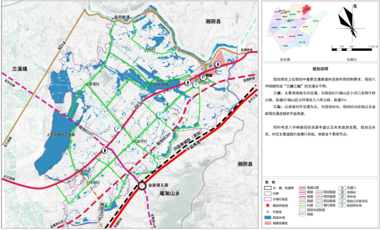 规划落实上位规划中重要交通廊道和设施布局控制要求,规划八字哨镇形成“三横三纵”的交通主干网。