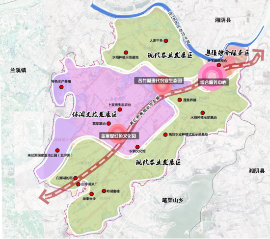 多点:以集镇、金家堤红色文化园、苦竹湖现代农业生态园为核心,带动卜豆壳生态农业、洞庭粮仓、来仪湖国家湿地公园(白濒湖)高效农业种植试验示范基地、大湖甲鱼、特色水产养殖等多产业融合发展。