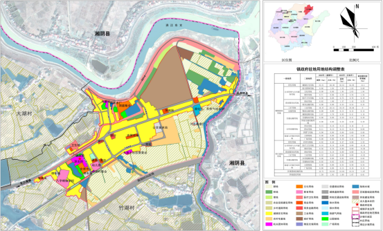 规划用地结构:为“一带、三心、三轴、四区”。“一带”即指资江东支生态保护带。心”是指规划区内的三个功能中心,即围绕镇政府形成的行政管理中心;围绕洞庭粮仓形成的旅游活动中心;围绕集市形成的商业金融中心。“三轴”是指沿现状G536、规划G536和X014的城镇发展轴。“三区”是指以行政、教育、医疗为主的综合服务区;以居住、旅游娱乐为主的休闲居住区;以工业、客运为主的产业发展区;以耕地保护为主的农田保护区。