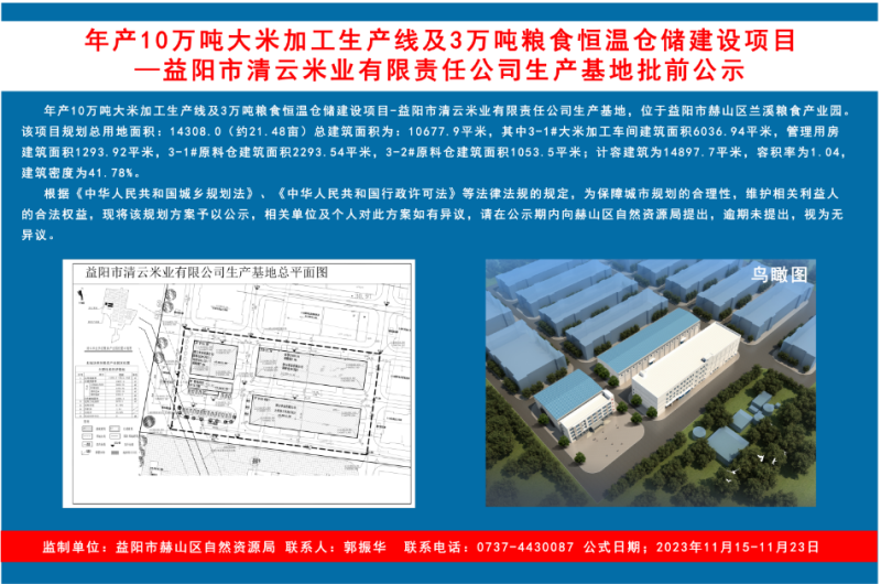 年产10万吨大米加工生产线及3万吨粮食恒温仓储建设项目—益阳市清云米业有限责任公司生产基地修建性详细规划方案批前公示