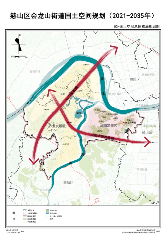 构建总体新格局。以会龙山街道地形地貌的基本特征为基础,结合“双评价”成果,明晰开发保护区域及轴带,确定“一江一河携九山,两轴纵横带三区”的国土空间开发保护总体格局。“一江”为资江;“一河”为志溪河;“九山”为会龙山片区的九座一级保护山体;“两轴”为益阳大道发展轴及G234发展轴;“三区”包括城镇集中发展区、生态保育区及农业发展片区。