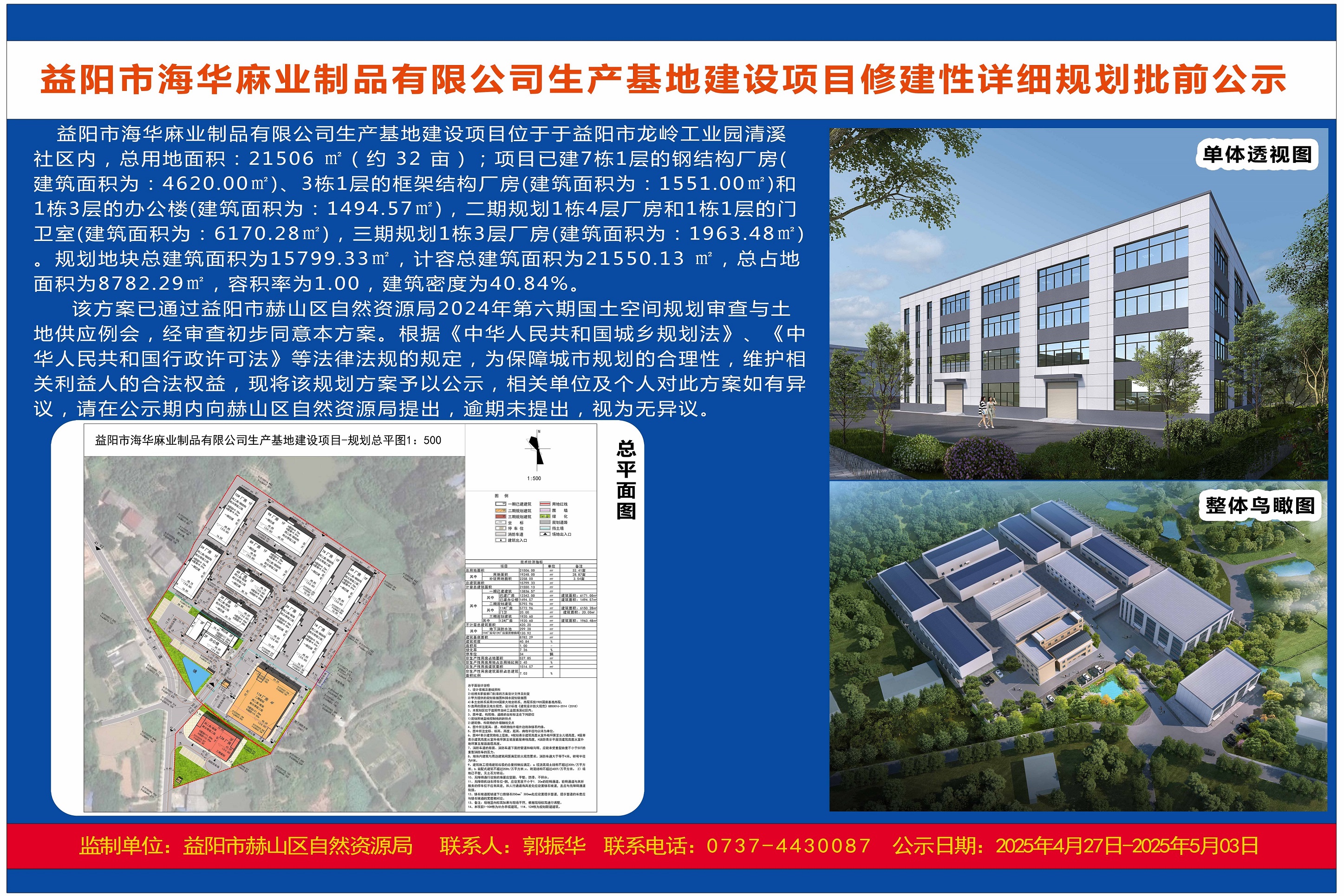益阳市海华麻业制品有限公司生产基地建设项目修建性详细规划批前公示