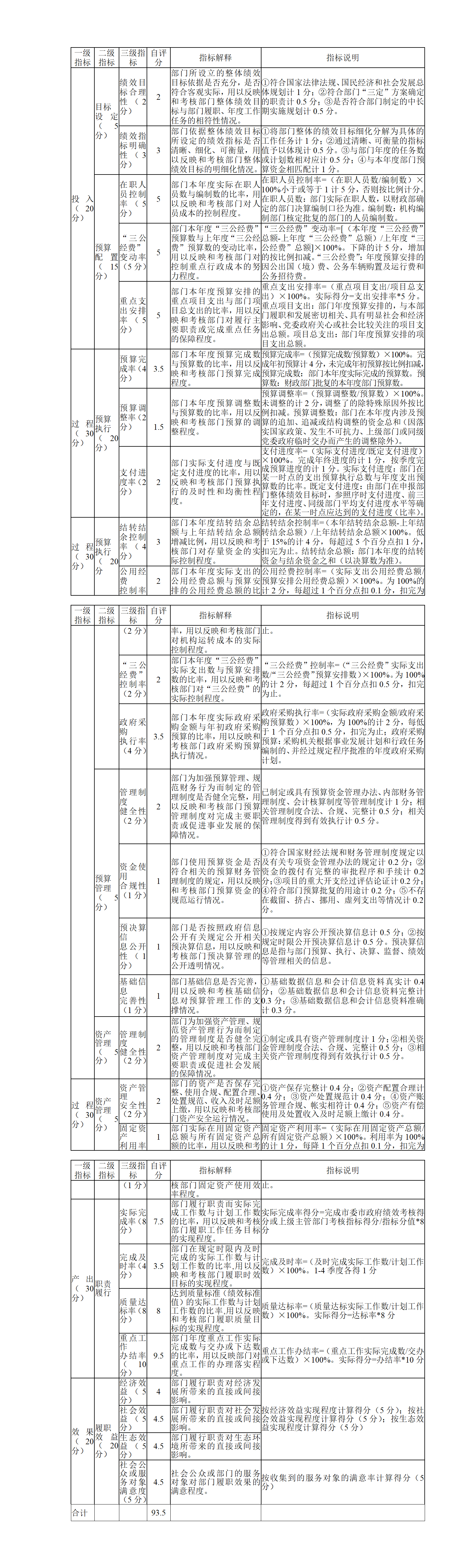 3.产出得28.5分,按规定做好政府性债务还本付息工作,部门和单位将国有资产纳入资产信息系统管理,按要求及时、准确、全面开展资产清查工作,报国有资产报表数据的真实、准确、全面,内部控制度健全完整,信息公开在财政部门批复二十日内向社会公开本部门预算、决算、绩效,部门实施绩效评价项目数量占部门申报绩效目标项目数量的比重,用以反映和考核部门实施绩效评价项目资金覆盖情况。