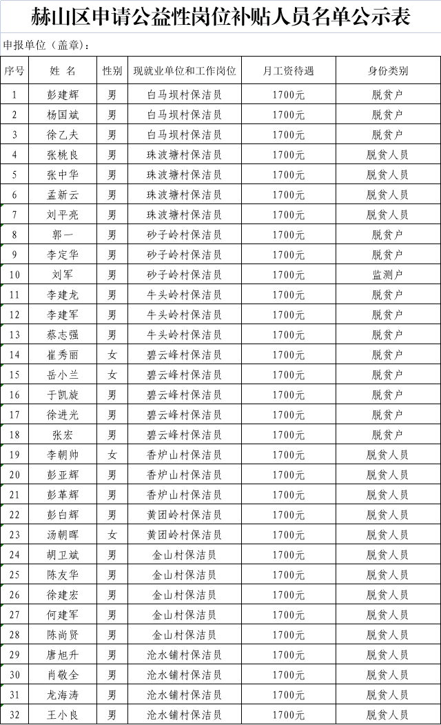 为助力乡村振兴,强化农村人居环境,解决农村脱贫人口就业问题,增加收入。经镇党委、政府研究,拟聘任32名符合公益性岗位补贴的保洁员,聘任人员均符合公益性岗位安置对象的相关规定和政策。为增加工作透明度,接受群众监督,现将公益性岗位人员名单向社会公示如下: