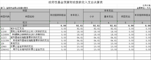 2022年度政府性基金预算财政拨款收入92.61万元;年初结转和结余0万元;支出92.61万元,其中基本支出92.61万元,项目支出0万元;年末结转和结余0万元。具体情况如下: