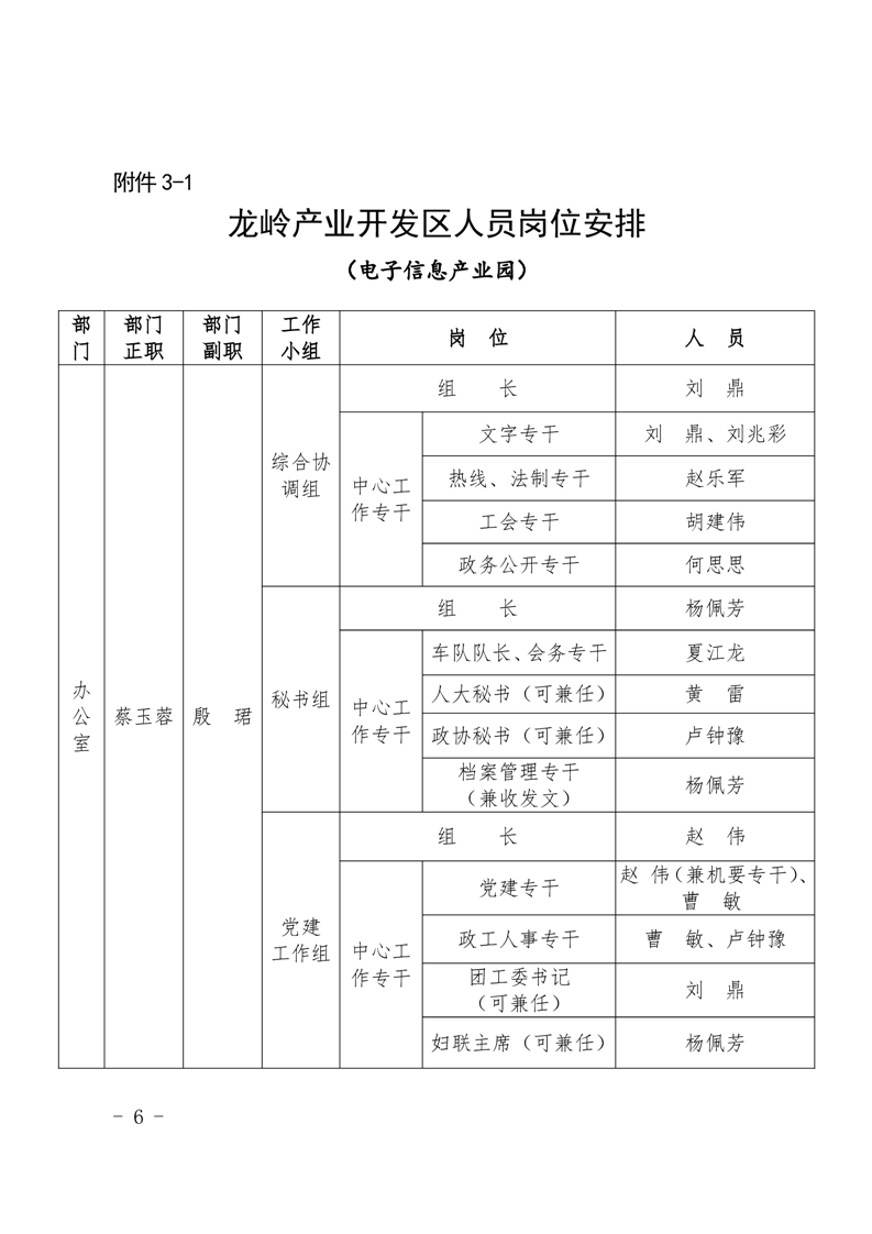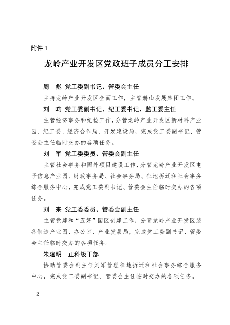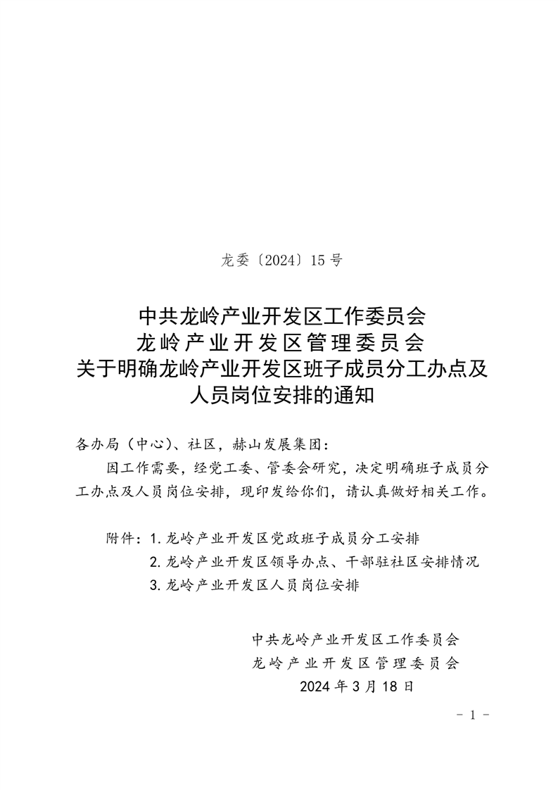 2024年3月关于明确龙岭产业开发区班子成员分工办点及人员岗位安排的通知