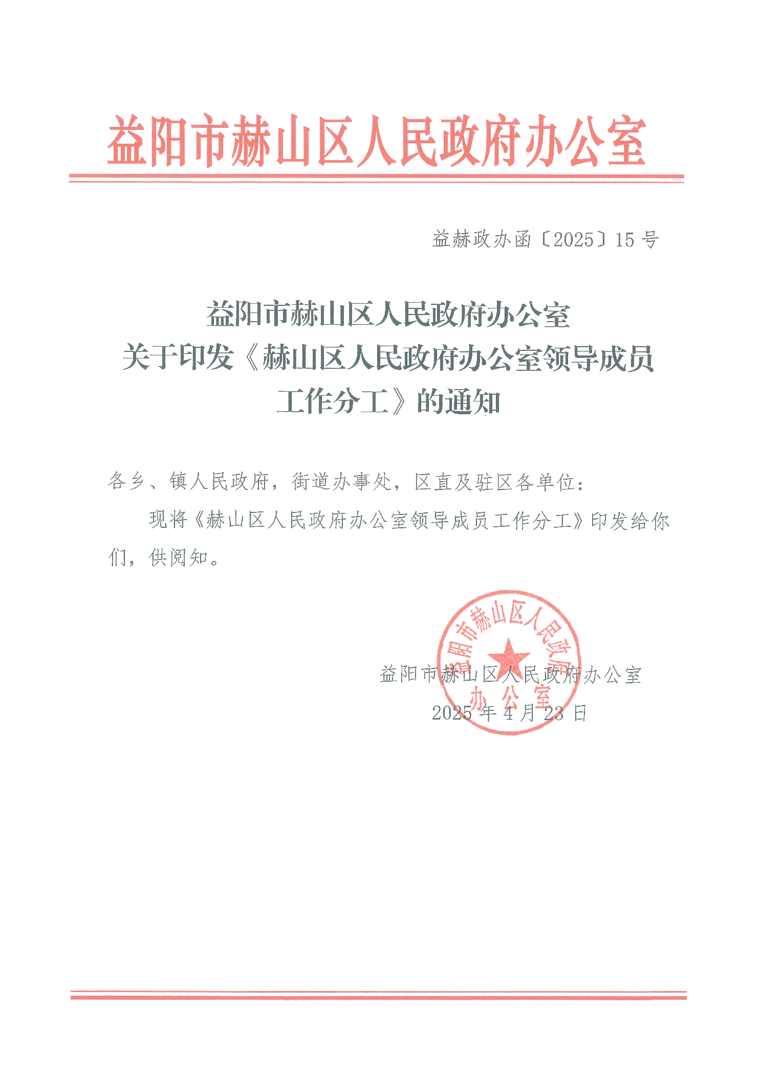 益阳市赫山区人民政府办公室关于印发《赫山区人民政府办公室领导成员工作分工》的通知(2025)