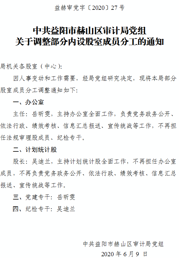 中共益阳市赫山区审计局党组关于调整部分内设股室成员分工的通知