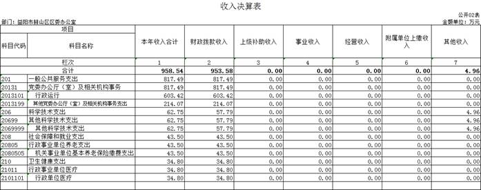 2022年度收入合计958.54万元,其中:财政拨款收入953.58万元,占99.48%;上级补助收入0元,占0%;事业收入0万元,占0%;经营收入0万元,占0%;附属单位上缴收入0万元,占0%;其他收入4.96万元,占0.52%。