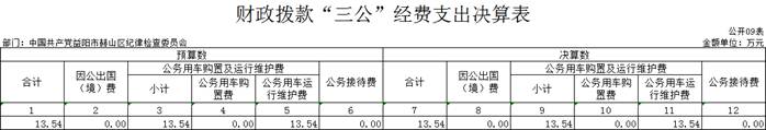 “三公”经费财政拨款支出预算为13.54万元,支出决算为13.54万元,完成预算的100%,其中: