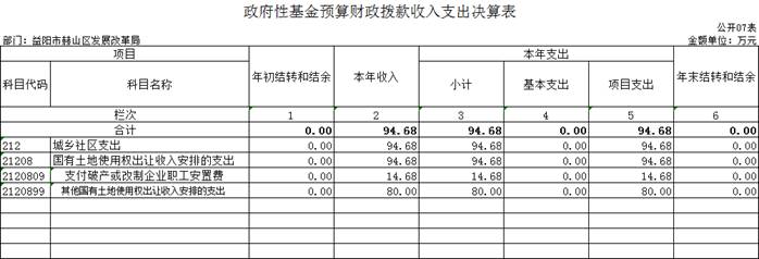 年初预算为0万元,支出决算为14.68万元,决算数大于年初预算数的主要原因是拨付卢国华(原赫山区粮食局普济粮站)项目用地的土地出让金14.68万元。
