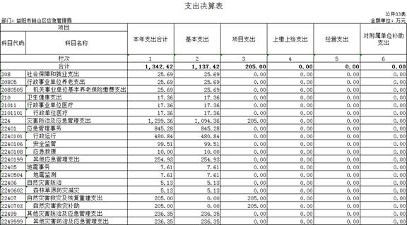 本年支出合计1342.42万元,其中:基本支出1137.42万元,占84.73%;项目支出205万元,占15.27%。基本支出主要用于应急管理事务和安全监管。项目支出主要用于自然灾害救灾及恢复重建支出。