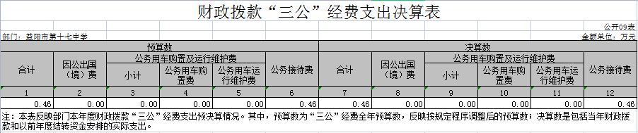 “三公”经费财政拨款支出预算为0.46万元,支出决算为0.46万元,完成预算的100%,其中: