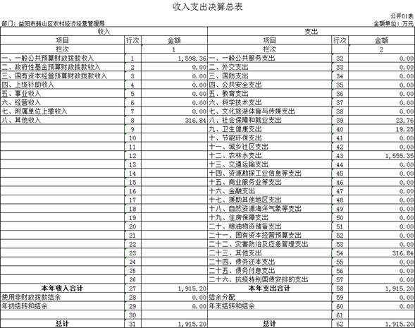 2022年度收、支总计1915.20万元。与上年593.44万元相比,增加1321.76万元,增长222.73%,主要原因是2022年财政拨款预算收入的增加导致和去年相比收入、支出的增加,如中央省级家庭农场与农民合作社的专项资金拨付。