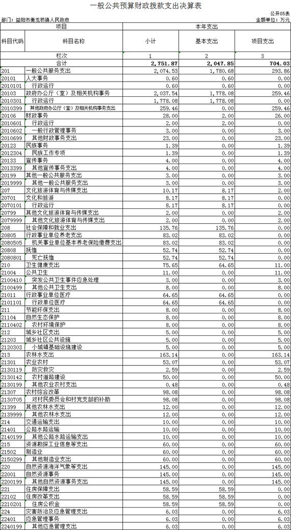 2022年度财政拨款支出2751.87万元,主要用于以下方面:一般公共服务支出2074.53万元,占75.38%;文化旅游体育与传媒支出10.17万元,占0.36%;社会保障和就业支出135.76万元,占4.93%;卫生健康支出75.65万元,占2.75%;节能环保支出8万元,占0.29%;城乡社区支出5万元,占0.18%;农林水支出163.14万元,占5.93%;交通运输支出10万元,占0.36%;资源勘探工业信息等支出60万元,占2.2%;自然资源海洋气象等支出145万元,占5.27%;住房保障支出58.59万元,占2.13%;灾害防治及应急管理支出6.03万元,占0.22%。