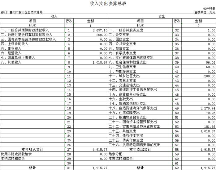 2022年度收、支总计4915.77万元。与上年相比,增加539.63万元,增长12.33%,主要是因为土地综合整治项目、国土空间规划编制项目资金增加。