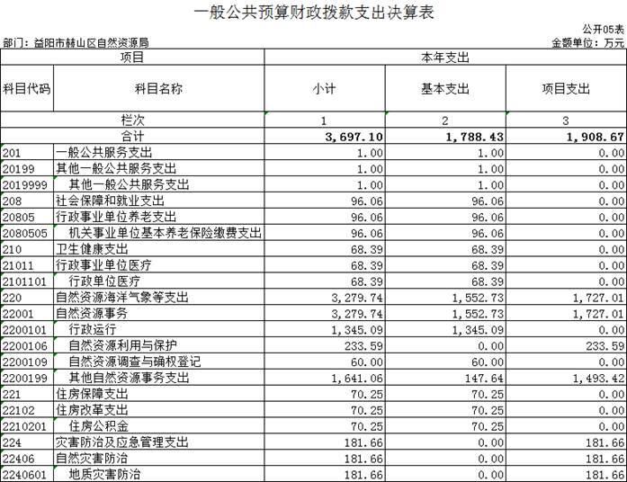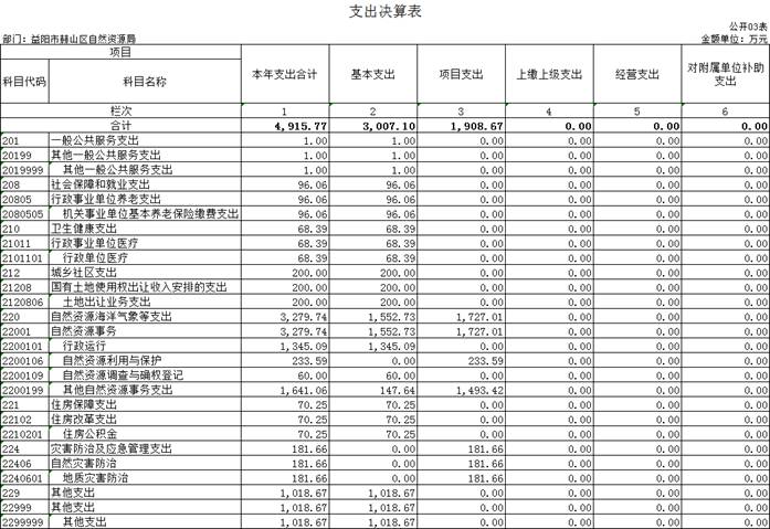 2、支出情况:2022年赫山区自然资源局决算支出4915.77万元,其中基本支出3007.10万元(人员经费支出1583.46万元、公用经费支出1423.64万元),占比61.2%;项目支出1908.67万元,占比38.8%。