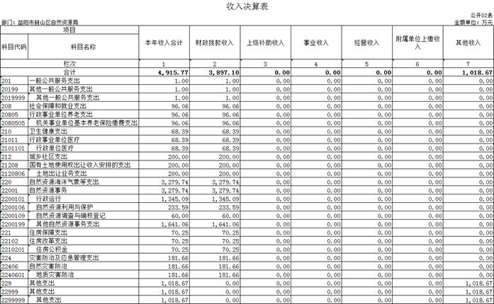 1、收入情况:2022年赫山区自然资源局决算收入4915.77万元,其中财政拨款收入3697.1万元,政府性基金财政拨款收入200万元,其他收入1018.67万元。