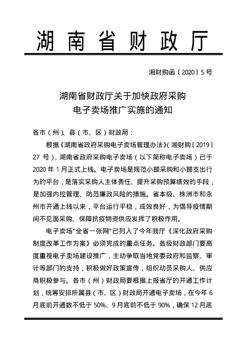 湖南省财政厅关于加快政府采购电子卖场推广实施的通知