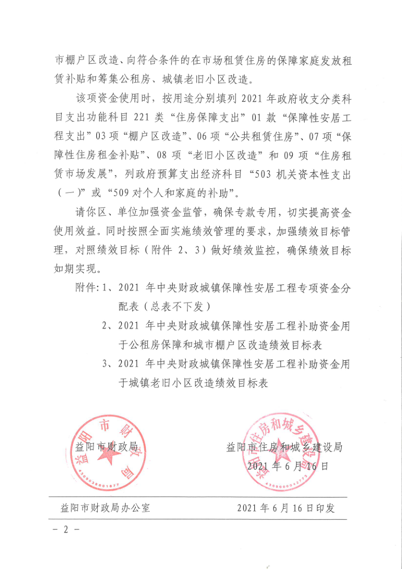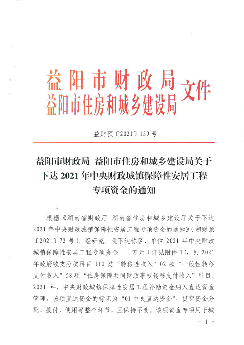 益阳市财政局 益阳市住房和城乡建设局关于下达2021年中央财政城镇保障性安居工程专项资金的通知