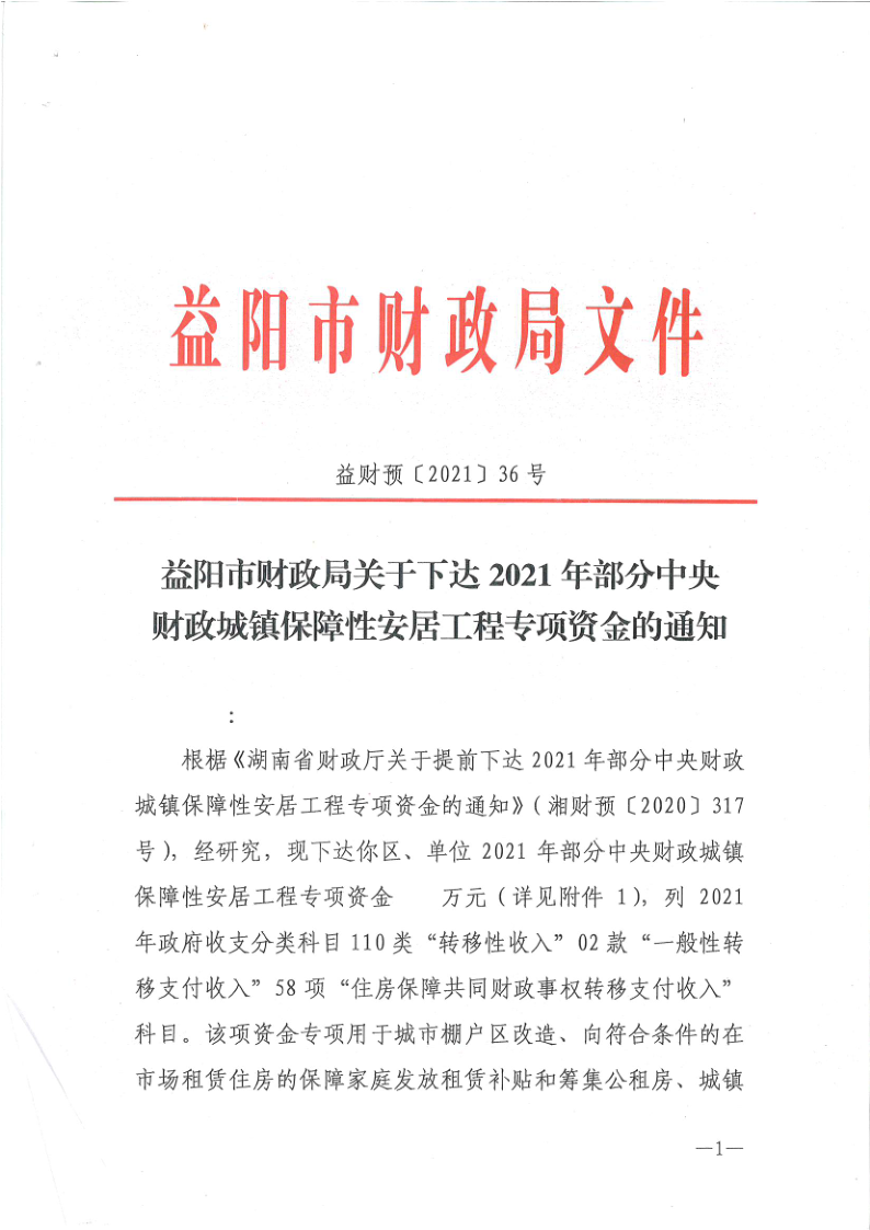 益阳市财政局关于下达2021年部分中央财政城镇保障性安居工程专项资金的通知