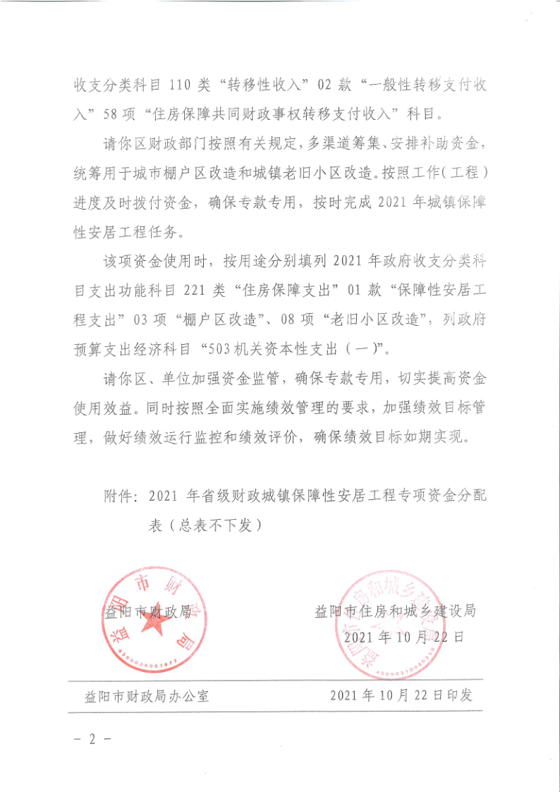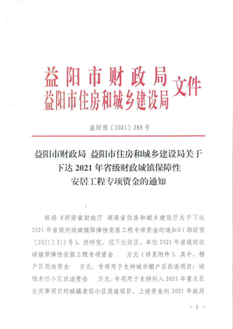 益阳市住房和城乡建设局关于下达2021年省级财政城镇保障性安居工程专项资金的通知