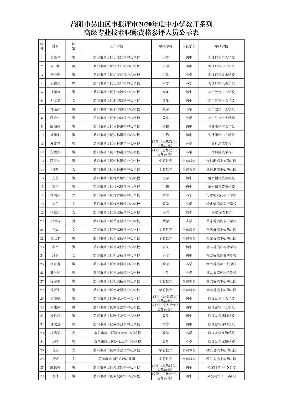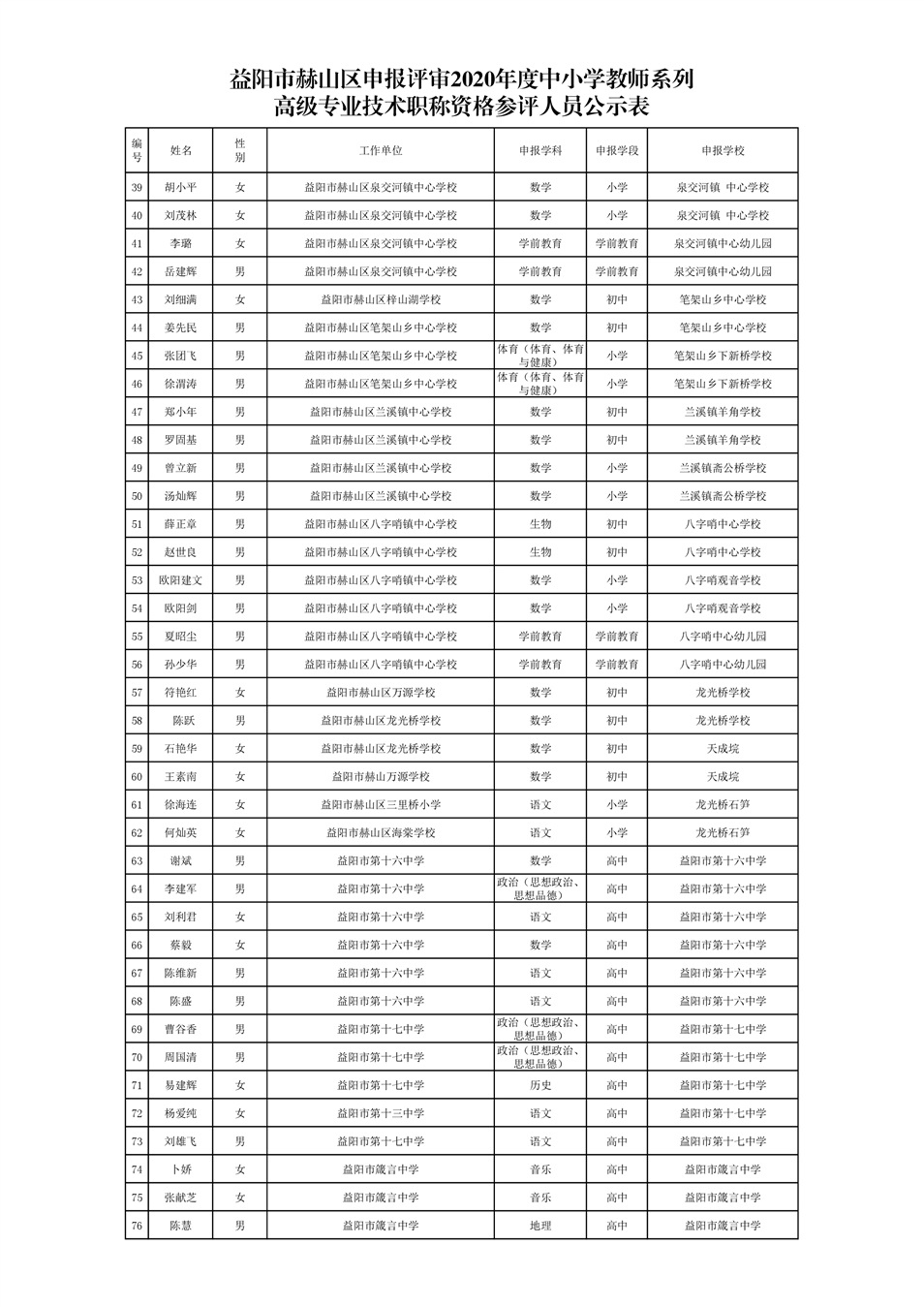 赫山区首次基层乡村中小学教师系列高级教师职称评审拟推荐参评人员名单公示