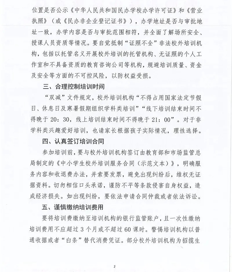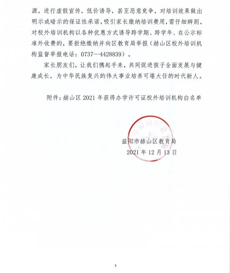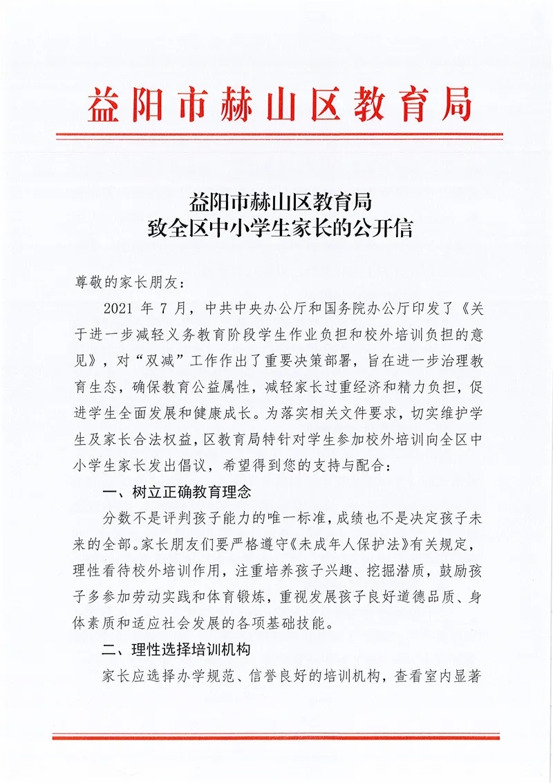 致全区中小学生家长的公开信(附赫山区2021年校外培训机构白名单)