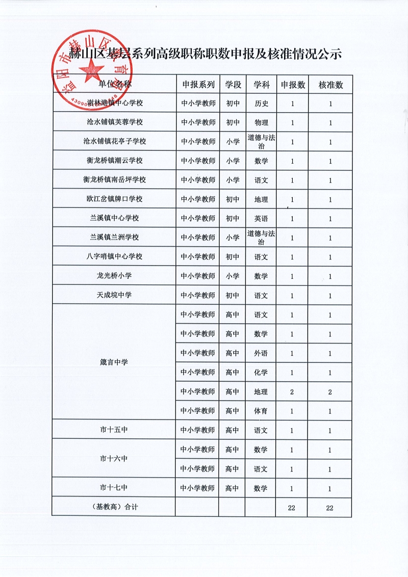 2023年赫山区基层系列高级职称职数申报及核准情况公示