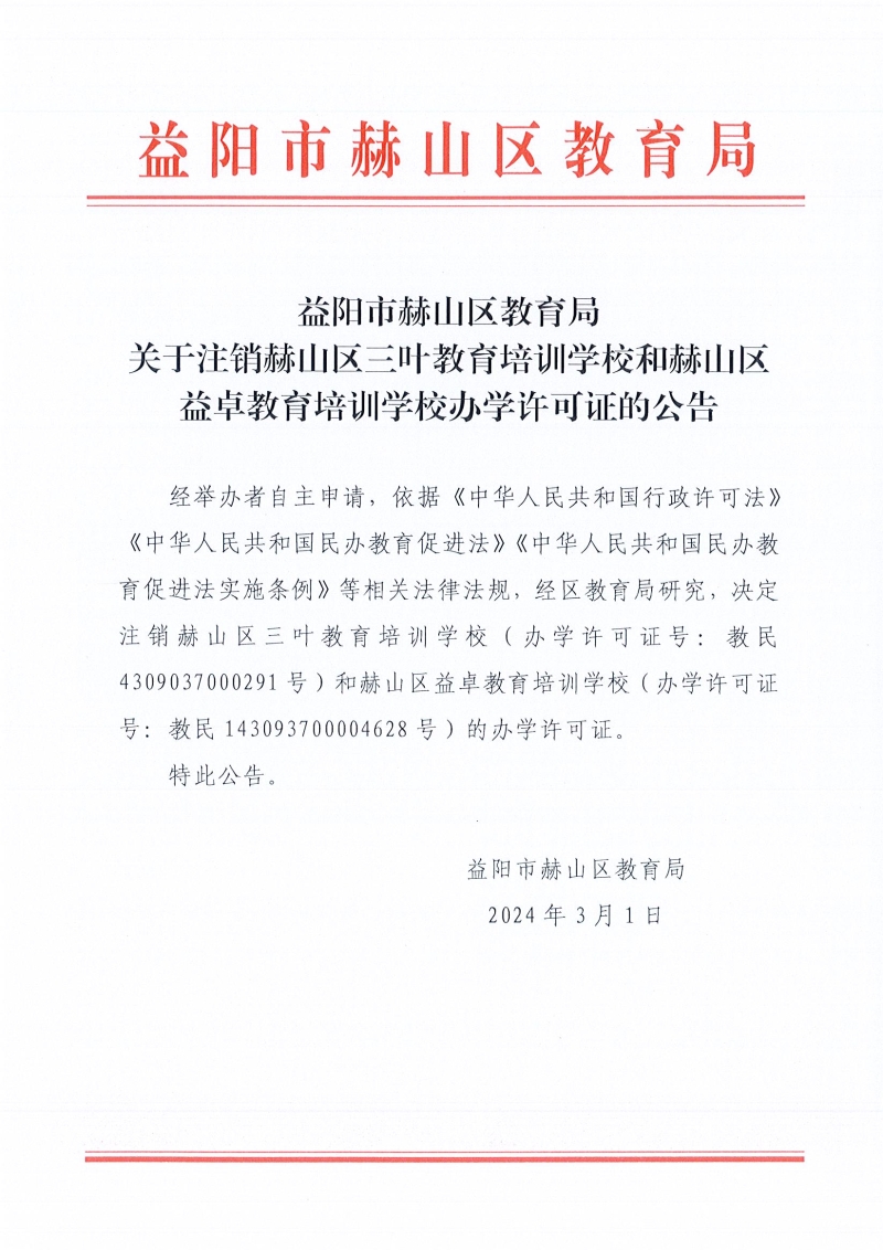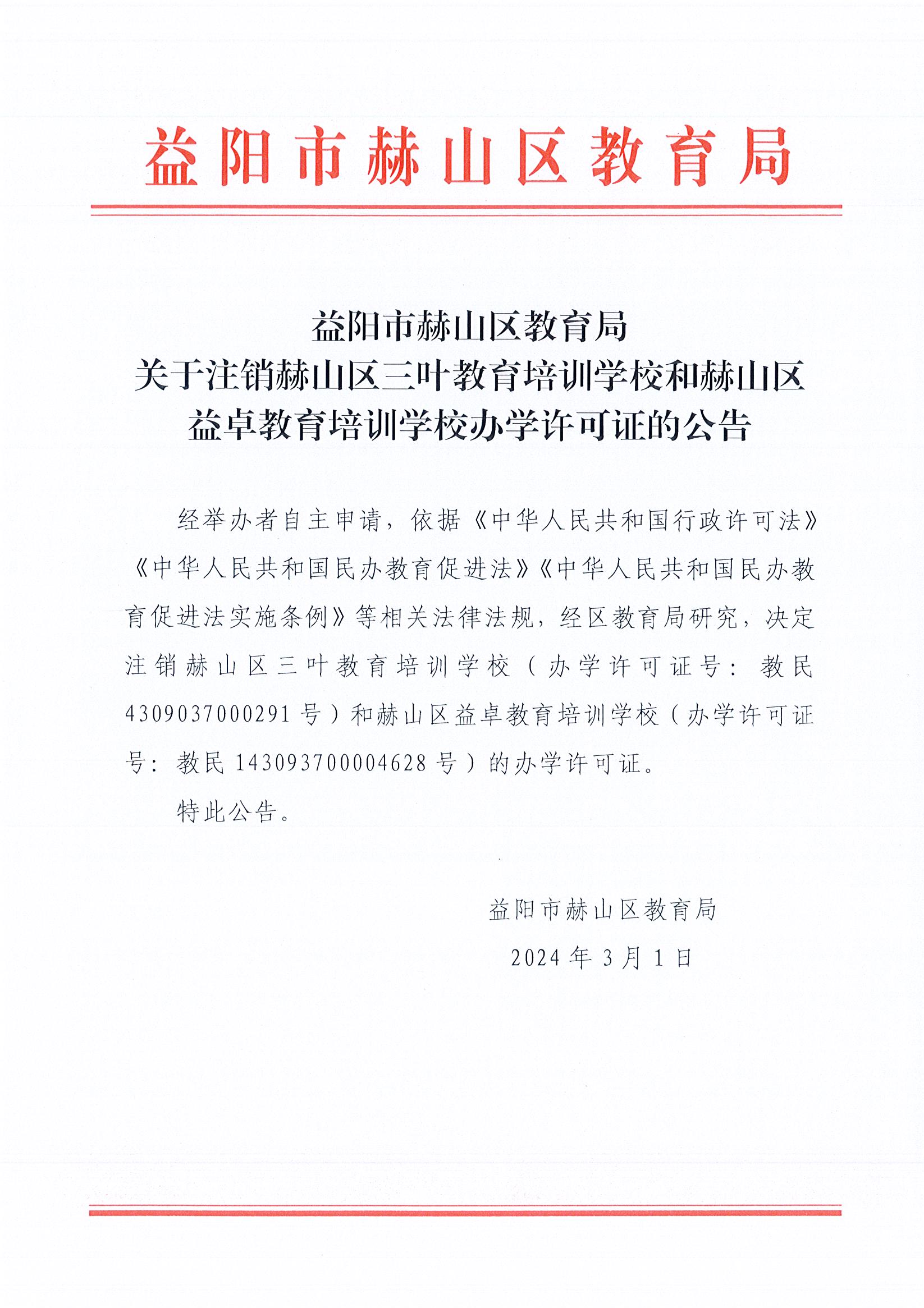 关于注销赫山区三叶教育培训学校和赫山区益卓教育培训学校办学许可证的公告