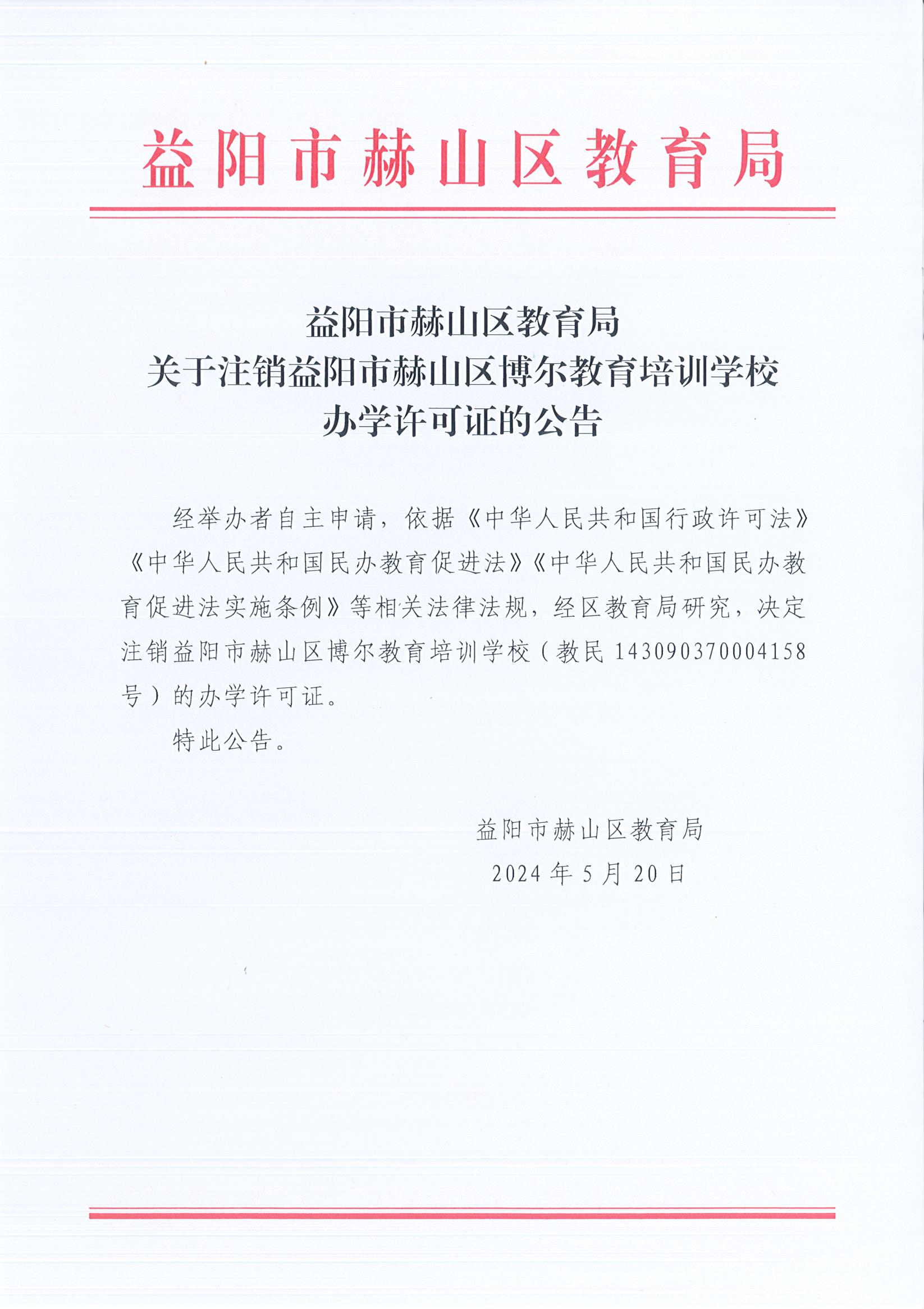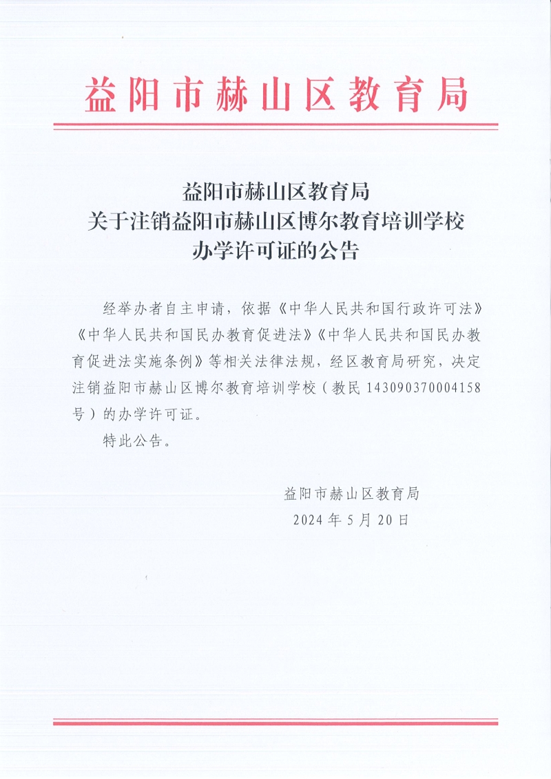 关于注销益阳市赫山区博尔教育培训学校办学许可证的公告
