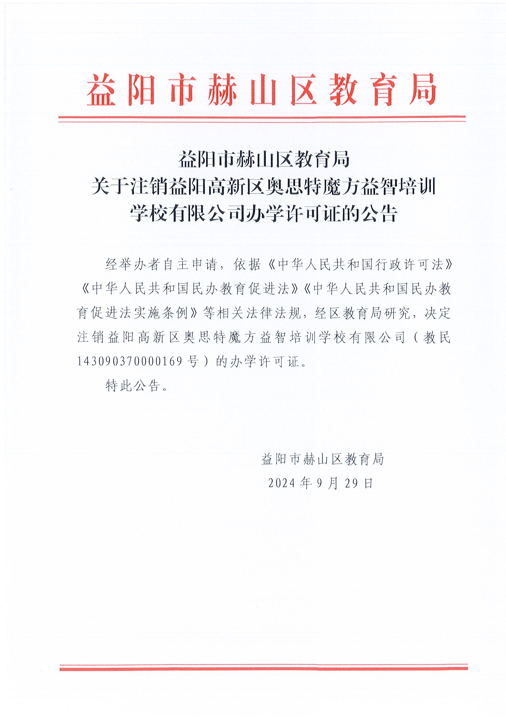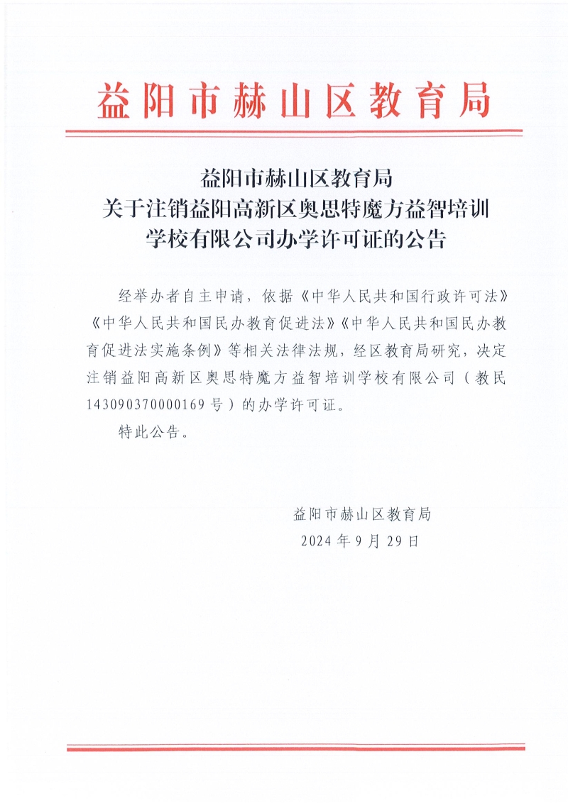 关于注销益阳高新区奥思特魔方益智培训学校有限公司办学许可证的公告